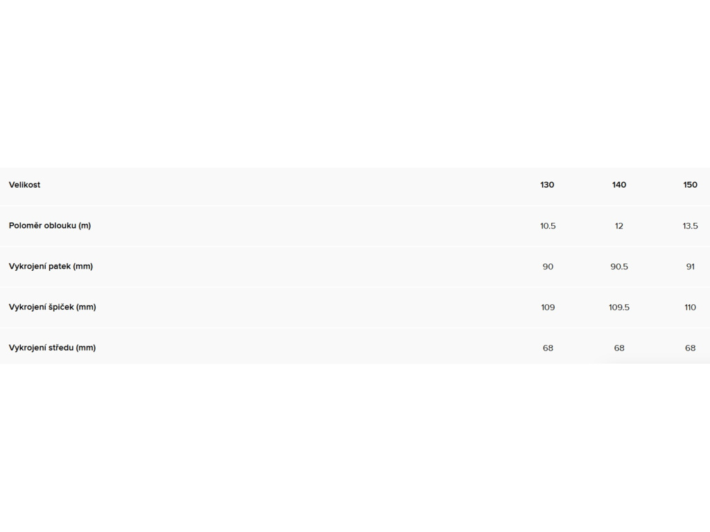 Hmotnost jedné lyže: 1798 g (140 cm)