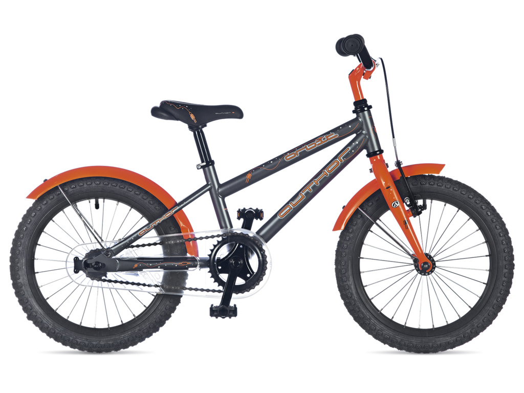 Author Orbit je chlapecké 16" kolo postavené na ocelovém rámu s pevnou vidlicí, vhodné pro děti s výškou postavy od 100 do 120 cm. Vybaveno je i praktickými blatníčky a bezpečnostním krytem řetězu.