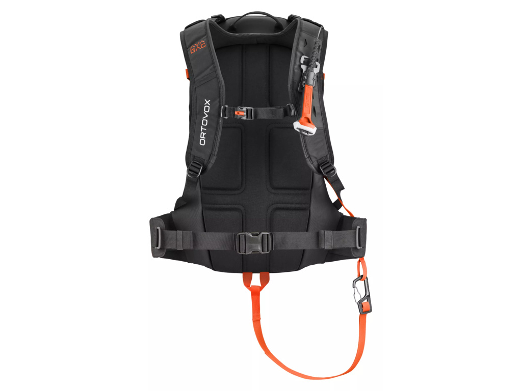 Pojistný popruh mezi nohama je proveden ve svítivě oranžové barvě, pro rychlou a jasnou kontrolu správného zajištění před sjezdem. Účelem popruhu je zabránit strhnutí batohu z těla v jedoucí lavině. Díky provedení pojistného popruhu může být přezka bederního popruhu pohodlně zacvakávací, jako je u nelavinových batohů běžné. Zacvakávací přezka bederáku tak zásadně zvyšuje uživatelský komfort, hlavně při rychlém rozepínání před nástupem na lanovku.
