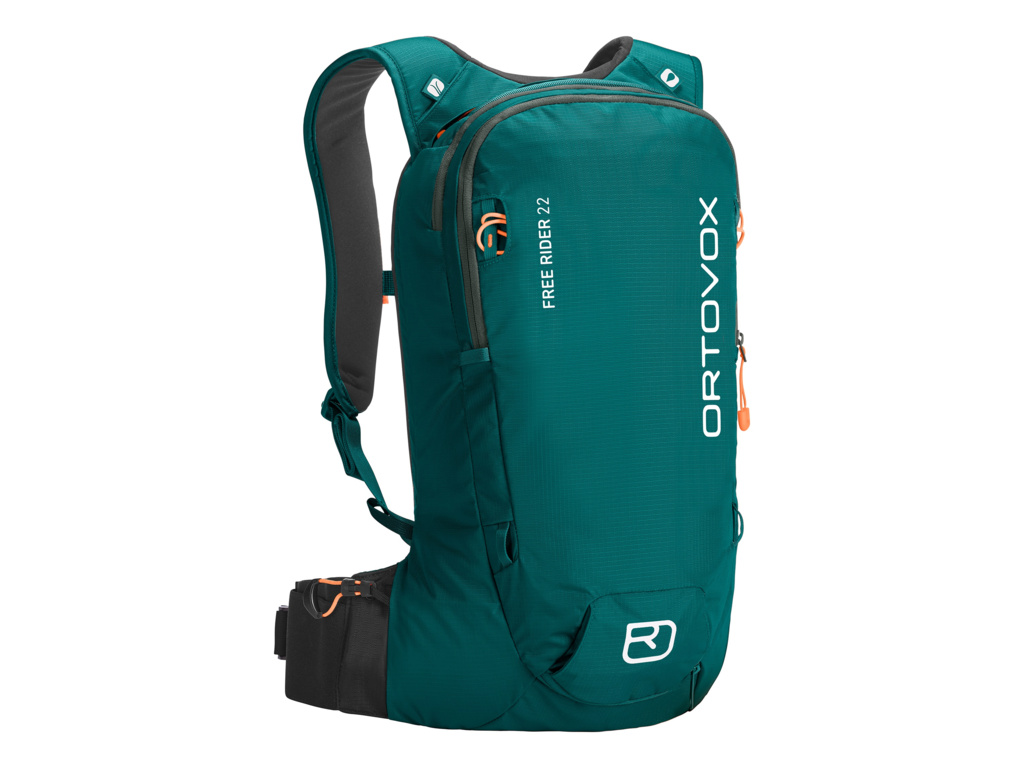 ORTOVOX Free Rider 22 l je určen jak pro lyžaře, tak pro snowboardisty, kteří chtějí batoh na ty nejnáročnější sjezdy. Chlubí se možností vložení certifikovaného chrániče páteře Clasp Spine Protector (chránič není součástí balení) pro vaši maximální ochranu. Hmotnost batohu je pouhých 1000 g. Má široký bederní pás, který snadno nastavíte a následně dotáhnete pomocí integrovaného stahovacího systému Clasp Flex Blet. Široké a pohodlné ramenní popruhy lépe rozloží hmotnost batohu mezi vaše ramena, záda a bedra. Zádový systém je tvořen vycpávkami z paměťové pěny v 6 zónách. Do hlavní komory se dostanete přes záda. Jednoduše položíte batoh čelem do sněhu a otevřeš jako kufr – vše je přehledně vidět. Naleznete zde přihrádku na rezervoár vody a výstup na hadičku, která vede do ramenního popruhu. Komora je dostatečně prostorná na vybavení, které potřebujete udržet v suchu. Druhá komora slouží jako bezpečnostní lavinová kapsa. Mokré vybavení je pak oddělené od zbytku věcí. Kapsa má úmyslně oranžová poutka zipů, aby byla ihned na očích v případě nouze. Ve spodní části batohu je možnost uchytit přilbu.