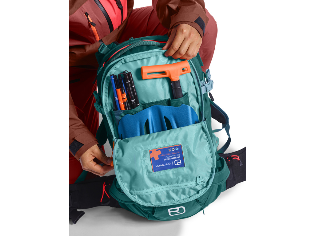 ORTOVOX Free Rider 26 l je určen jak pro lyžaře, tak pro snowboardisty, kteří chtějí batoh na ty nejnáročnější sjezdy. Chlubí se možností vložení certifikovaného chrániče páteře Clasp Spine Protector (chránič není součástí balení) pro vaši maximální ochranu. Hmotnost batohu je pouhých 1000 g. Má široký bederní pás, který snadno nastavíte a následně dotáhnete pomocí integrovaného stahovacího systému Clasp Flex Blet. Široké a pohodlné ramenní popruhy lépe rozloží hmotnost batohu mezi vaše ramena, záda a bedra. Zádový systém je tvořen vycpávkami z paměťové pěny v 6 zónách. Do hlavní komory se dostanete přes záda. Jednoduše položíte batoh čelem do sněhu a otevřeš jako kufr – vše je přehledně vidět. Naleznete zde přihrádku na rezervoár vody a výstup na hadičku, která vede do ramenního popruhu. Komora je dostatečně prostorná na vybavení, které potřebujete udržet v suchu. Druhá komora slouží jako bezpečnostní lavinová kapsa. Mokré vybavení je pak oddělené od zbytku věcí. Kapsa má úmyslně oranžová poutka zipů, aby byla ihned na očích v případě nouze. Ve spodní části batohu je možnost uchytit přilbu.