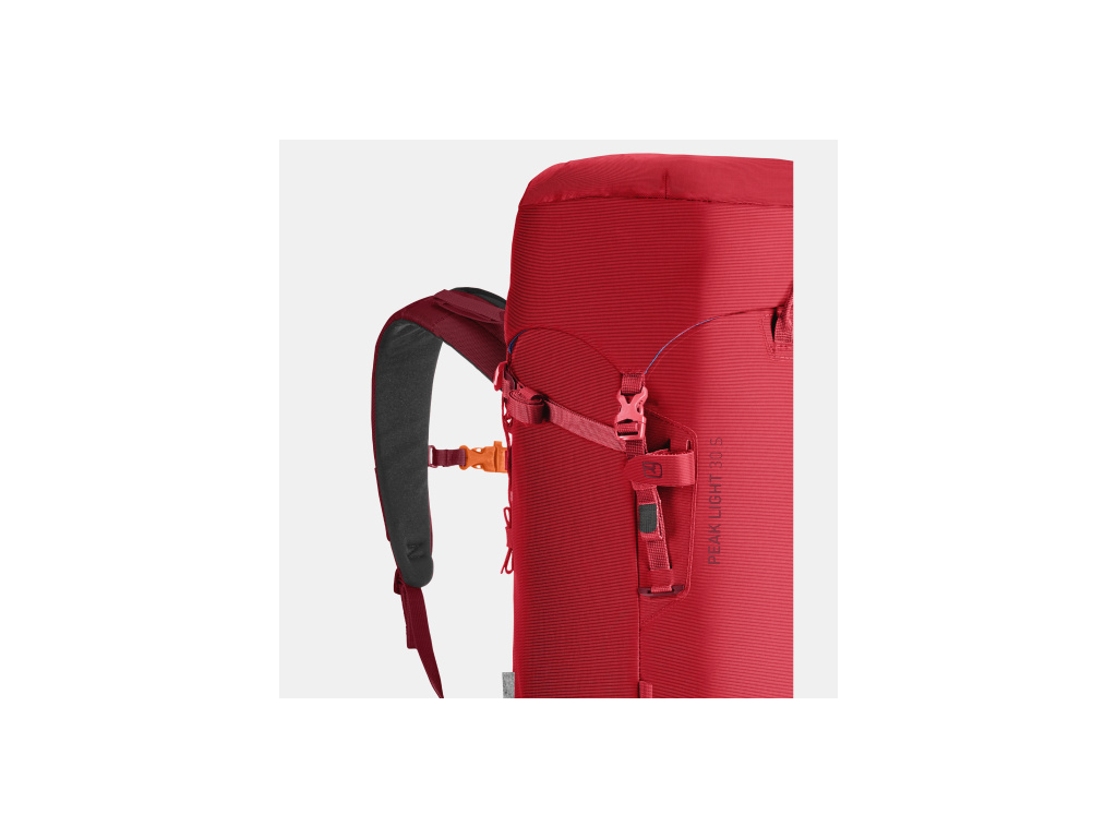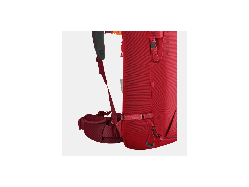 ORTOVOX Peak Light 30 l je technický a objemný batoh, na který připevníte velké množství vybavení od trekových holí, přes lano, cepíny až po lyže. Možnost dostat se až na 690 g hmotnosti ocení každý, komu záleží na hmotnosti a nechce přijít o důležité funkční prvky. Inovativní zádový systém SWISSWOOL-TEC-KNIT vám zaručí pohodlí a otevírání na přední straně pomocí oboustranného obvodového zipu přehled na první dobrou. O rozložení váhy se stará vycpaný široký bederní pás a ramenní popruhy, které jsou z vnitřní strany tlumené, aby vás netlačily na krku. Batoh má několik praktických kapes. Každá komora a kapsa má svůj účel a dovoluje mít věci po ruce kdykoli je to potřeba. Prostor uvnitř hlavní komory nabízí uchycení lavinového vybavení – lopaty a sondy. Hlavní komora má elastický popruh na upevnění lahve s vodou nebo rezervoáru a sponu na jeho připevnění – navíc s možností vyvést hadičku v středu batohu mezi ramenními popruhy. Přední kapsa je na zip – na mapu, topo a buzolu. Vnější kapsa víka slouží pro odložení aktivních doplňků – čepice, rukavice, šátek apod.Ve vnější kapse víka je i plastová karabina na klíče.