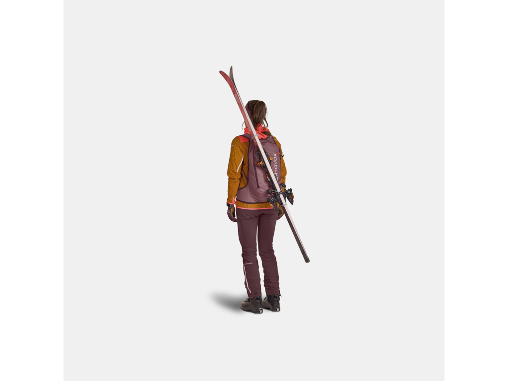 ORTOVOX Powder rider 16 l je špičkový batoh, který kombinuje minimalismus s plnou výbavou do volného terénu. Díky nízké hmotnosti (660 g), promyšleným technickým prvkům a zádovému systému, si na něj při sjezdech ani nevzpomenete. Vše důležité vybavení přitom budete mít vždy po ruce. Perfektně se hodí především na kratší skialpinistické výlety či jakoukoliv jinou zábavu v prašanu. Bez problému se do něj vejde jak bezpečnostní lavinové vybavení, tak všechny nezbytné drobnosti. Mezi jeho hlavní prvky patří prostor pro uložení lavinové výbavy, kompatibilita s hydratačními systémy a možnost diagonálního připnutí lyží (do šířky 150 mm). Každá kapsa na batohu má svůj účel a dovoluje vám mít věci ihned po ruce pro rychlou manipulaci. Prostor uvnitř hlavní komory slouží pro uchycení lavinového vybavení – lopaty a sondy – a také kapsu na láhev vody nebo rezervoár a sponu na připevnění. Přední kapsička na zip je určena na mapu a buzolu. Vnitřní kapsa s emergency card a poutkem na klíče slouží na uložení drobností – doklady, hotovost a cennosti. Síťka na přilbu je uložena vpředu batohu s praktickým zipem.