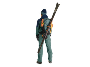 Výjimečností tohoto batohu je možnost připnutí a odepnutí lyží do kříže (D-skifix) bez nutnosti jeho skládání ze zad a to tak, že je převlečeš přes popruhové oko ve spodní části batohu a v horní části je upevníte omotáním popruhu s karabinkou, kterou následně připnete k ramennímu popruhu batohu.