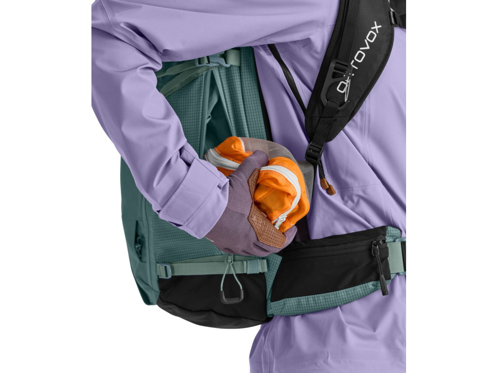 Lavinové vybavení a lehký cepín uložený v samostatné bezpečnostní přihrádce lze v případě nouze rychle vyndat, zatímco všechny věci v hlavní přihrádce jsou přístupné přes plně otevírací záda.  Díky speciální boční kapse máš mačky a stoupací pásy vždy po ruce i bez nutnosti sundávání batohu. Taky lano a lyže snadno sundáš i s batohem na zádech. Uchycení pro dva lezecké cepíny, daisy chain, uchycení na lano a síťka na helmu doplňují všestranné možnosti upevnění vybavení.