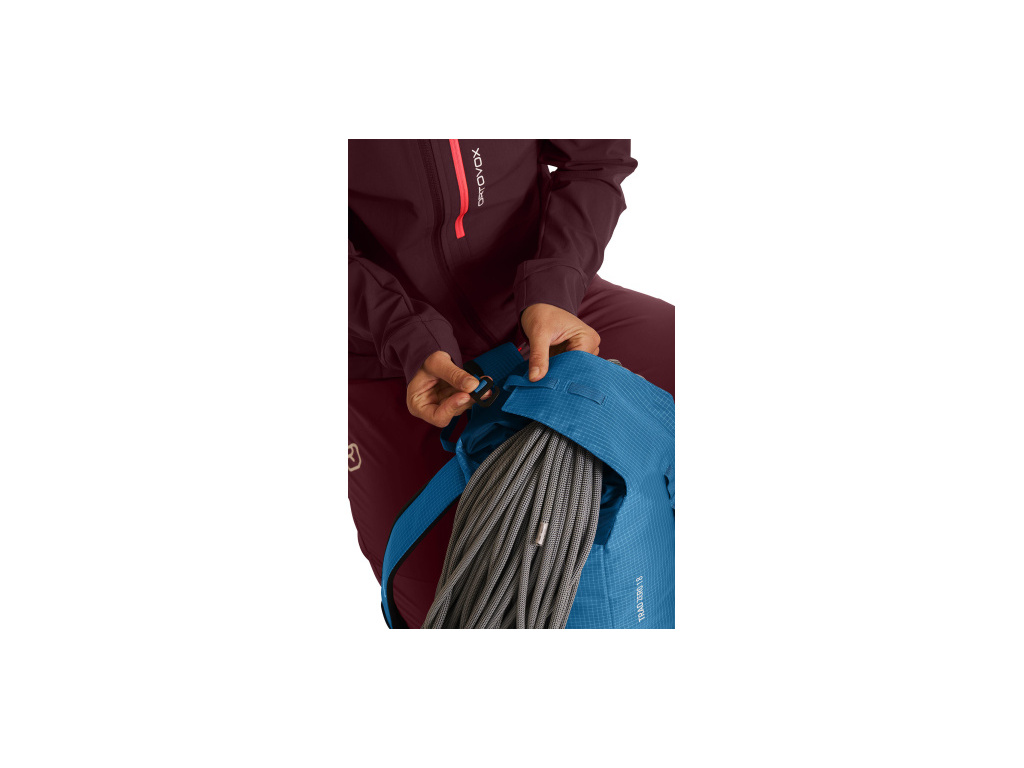 Z přední strany jsou očka na lezecký materiál a vrchním popruhem na batoh snadno připevníš lano nebo přilbu. Silikonová vrstva na vnitřní straně víka je protiskluzová, takže vše zůstane pevně na svém místě.