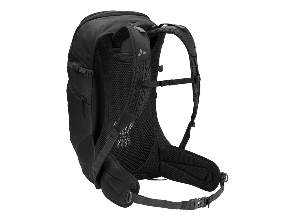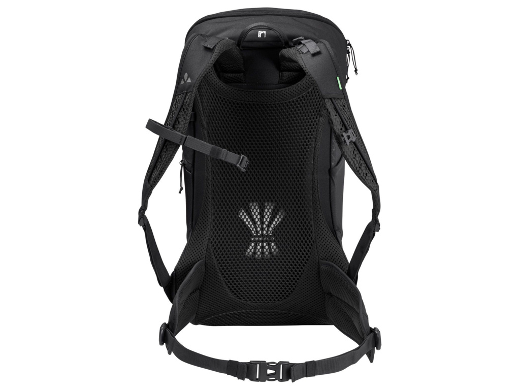 Hlavní přednost turistického batohu Agile Air 26 l se projeví v horkých letních dnech: zadní odvětrávaný nosný systém Aeroflex 3D vytváří mezi batohem a zády prostor otevřený ze tří stran. To umožňuje cirkulaci vzduchu na všech stranách a výrazně snižuje hromadění tepla. Výbava nenechává nic náhodě ani při celodenních túrách a v každodenním životě: na palubě je polstrovaná přihrádka na sluneční brýle a smartphone, elastická síťovaná kapsa na boku a držák na trekové hole. S objemem 26 litrů nabízí turistický batoh dostatek místa na oblečení do deště a na převlečení, svačinu a vodu i na drobnosti, jako je peněženka, GPS atd. Další vybavení lze připevnit na dva popruhy s poutky. Ramenní popruhy Ergoshape pohodlně sedí a neškrtí, zatímco bederní pás zajišťuje stabilní přenos nákladu. Označení VAUDE Green Shape znamená ekologický a funkční výrobek vyrobený z udržitelných materiálů s certifikací bluesign®.
