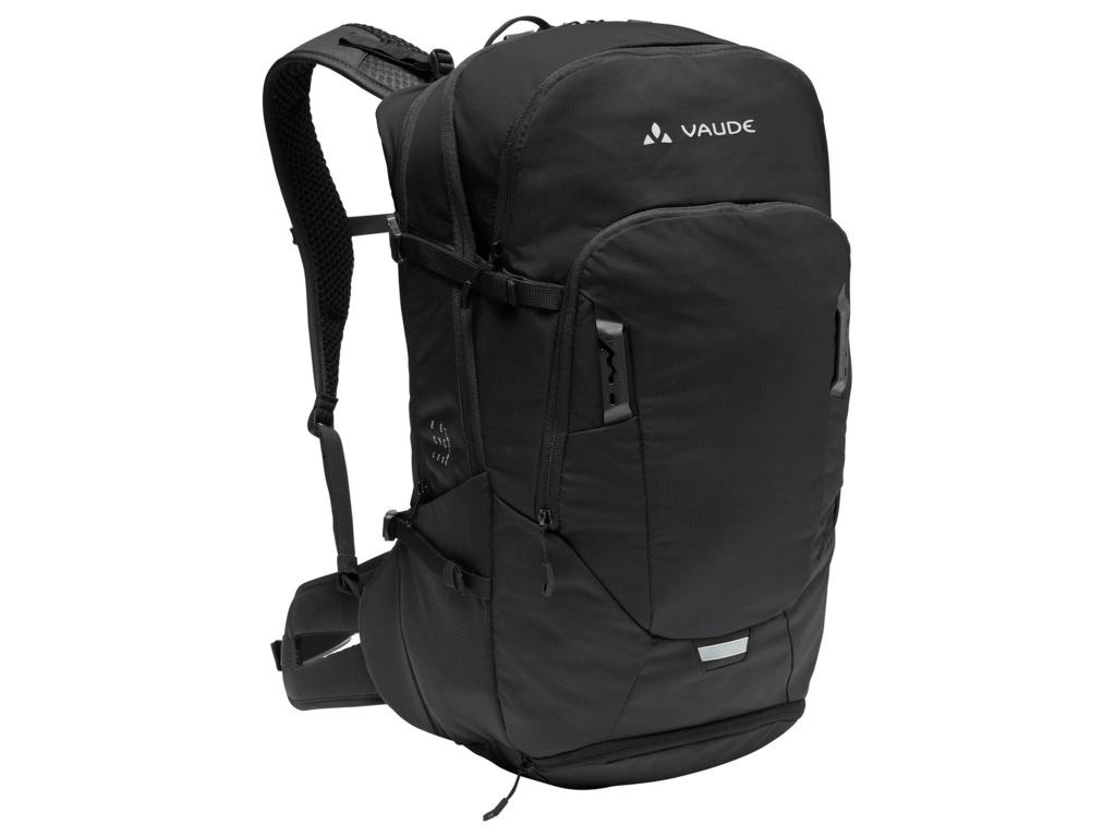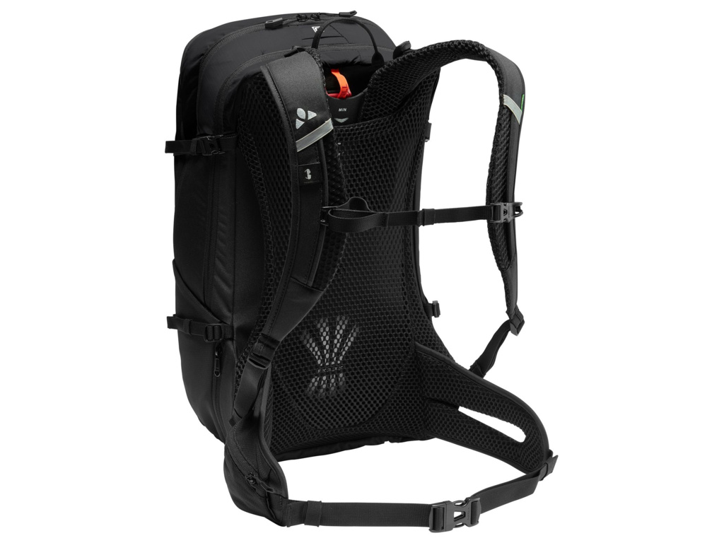 VAUDE Bike Alpin 30+5 je velký vícedenní batoh pro horskou cyklistiku. Chlubí se pohodlným zádovým systémem s ventilací, ideální pro vícedenní výlety / Alpencross.  Hlavní prostor má několik přepážek o objemu 32 litrů, možnost rozšíření o 5 litrů a samostatnou spodní komoru. Ve víku je kapsa na zip a přihrádka pro cyklo nářadí. Boční kapsa na zip je určená pro minipumpu a do bočních síťovaných kapes si uložíte pití nebo nezbytné drobnosti. Potěší vás vychytávky jako držák helmy, otvor pro hydratační systém, držák na klíč nebo možnost upevnění bezpečnostního světla. Reflexní prvky zvyšují vaši viditelnost, a tím i bezpečnost. U modelu se můžete spolehnout na perfektní střih a spolehlivé větrání s využitím F.L.A.S.H. nastavitelným ramenním popruhem.