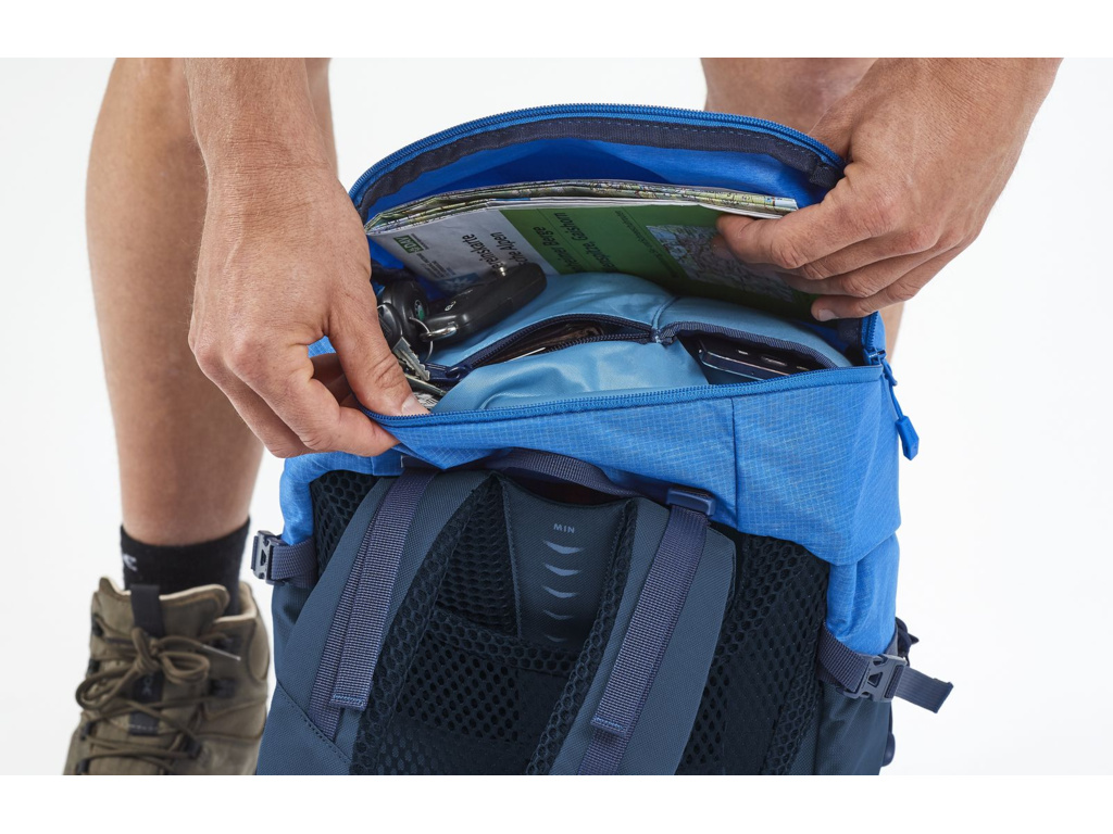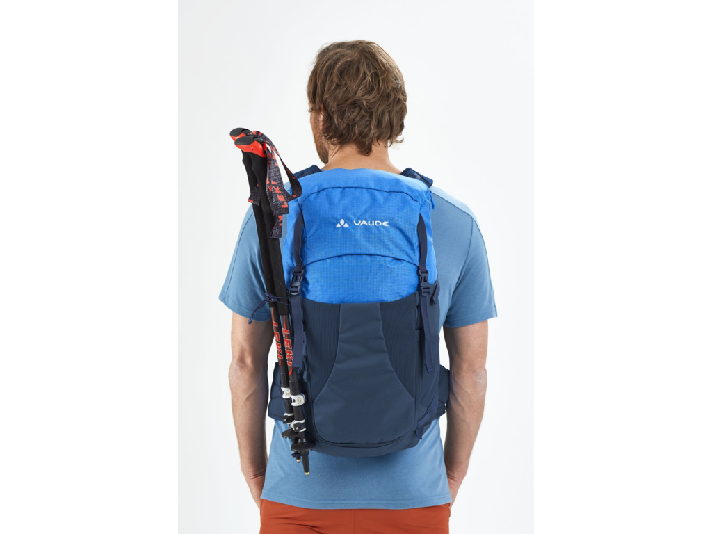 VAUDE Brenta 30 je oblíbený turistický batoh, do kterého se sbalíte i na několikadenní cestu. Má velký hlavní vnitřní prostor krytý klopou, jejíž výška lze nastavit. Speciální Aeroflex zádový systém udržuje zadní část batohu dostatečně daleko od vašich zad, aby tudy mohl ve velkém proudit vzduch a záda se tak nepotila. Systém F.L.A.S.H je použit v ramenním popruzích. Jsou speciálně děrované tak, aby jimi proudilo dostatek vzduchu, a při pohybu jste se pod nimi nepotili. V klopě je zabudovaná kapsa na zip a zaručeně vás potěší dvě boční kapsy a kapsa na předním panelu. Model je kompatibilní s vodním rezervoárem. Reflexní prvky na povrchu zvýší vaši viditelnost, a tím i bezpečnost.