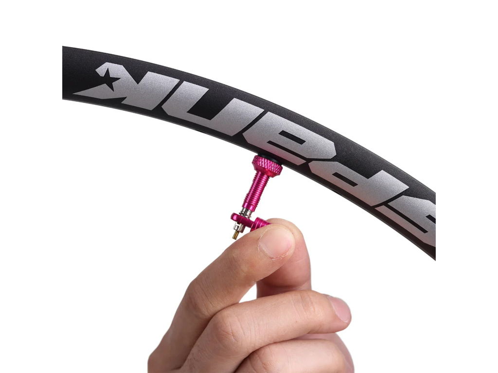 Bezdušové ventilky SPANK jsou vyrobeny z odolného mosazného materiálu a zkosené kulaté pryžové základny, která se hodí pro širokou škálu designů ráfků. Utěsněná vyjímatelná jádra ventilů pro vstřikování tmelu usnadňují doplňování. Čepička ventilu slouží jako nástroj pro odstranění jádra ventilku v případě potřeby. K dispozici v mnoha barvách.