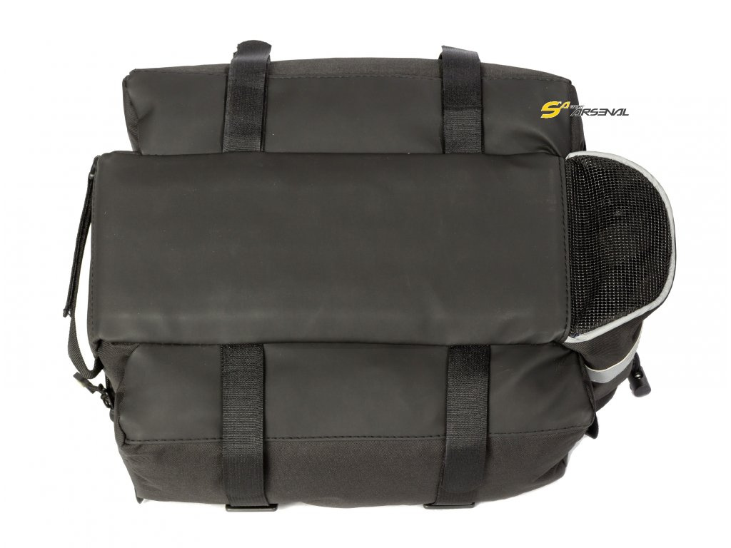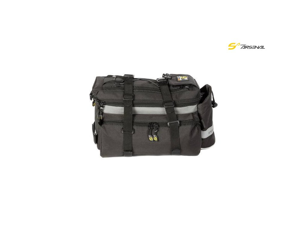 Víceúčelová brašna na zadní, nebo přední nosič s nastavitelným objemem - v případě rozepnutí horního zipu. Brašna má jednu velkou vnitřní kapsu a čtyři postranní vnější kapsy na zip pro praktické rozložení nákladu. Nasazení brašny je snadné, za pomoci suchých zipů. Dva stahovací popruhy napevno stahují vnitřní náklad, boky brašny jsou polstrované.