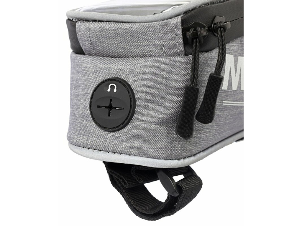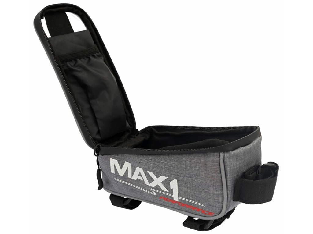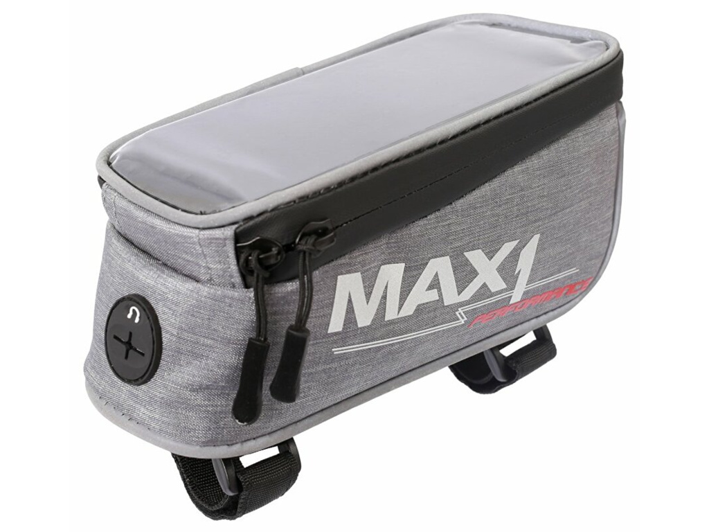 Kompaktní brašna MAX1 na rámovou trubku s kapsou uzpůsobenou pro mobilní telefon. Gumová membrána pro umístění sluchátek ve spodní části brašny. Pasuje na většinu standardních rámů.