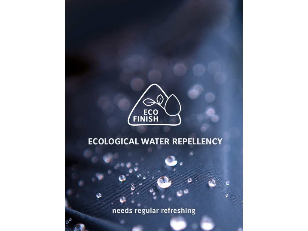 Povrchová úprava pláštěnky Eco Finish je silně voděodolná. Dešťové kapky na povrchu materiálu jednoduše kapou dolů a neulpívají na pláštěnce. Materiál je vyrobený ekologicky bez použití fluorovaných uhlovodíků, které škodí životnímu prostředí. Pláštěnka je ideální ochranou proti dešti a šetrný výrobek k naší přírodě.