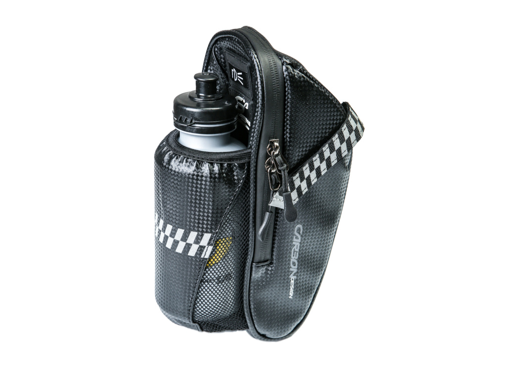 Brašna pod sedlo s kapsou pro cyklistickou lahev z moderního materiálu CarbonDesign pojme to nejdůležitější co je na cestách potřeba.