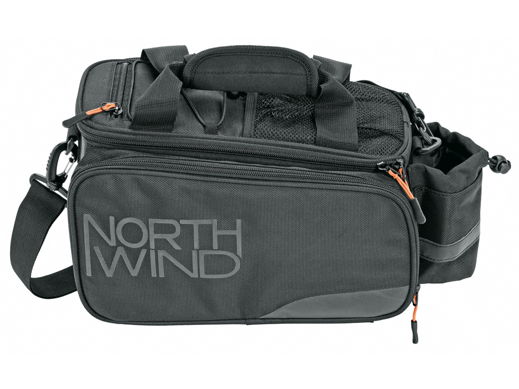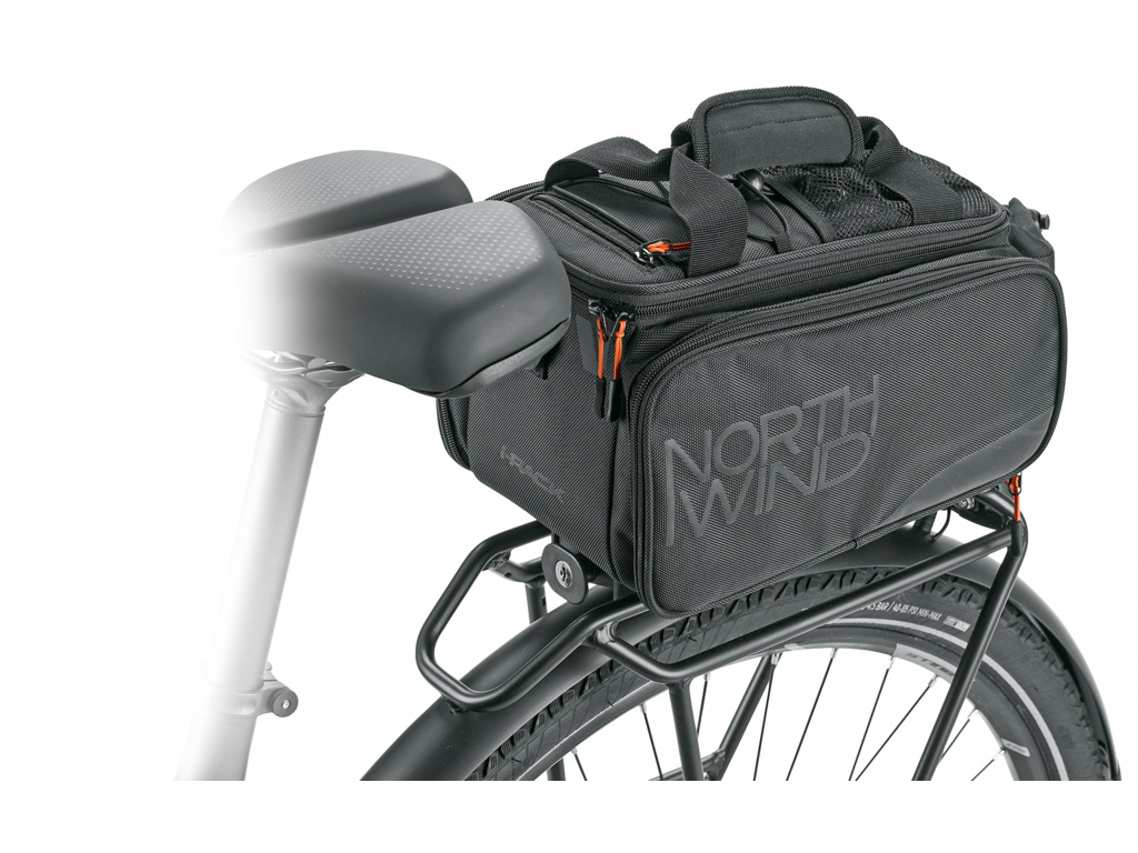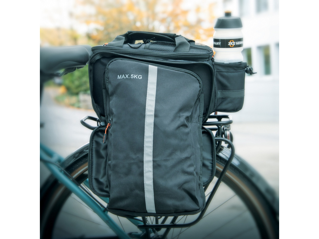 Brašna s držákem na pití a bočními kapsami. Úložná kapsa z elastické síťoviny umožňuje převážet další zavazadla. Cennosti jsou bezpečně uloženy v přihrádce na zip v horní části tašky a uvnitř tašky. Pláštěnka udrží tašku a obsah v suchu, zatímco reflexní prvky na voděodpudivé nylonové tkanině zajišťují viditelnost ve tmě.
