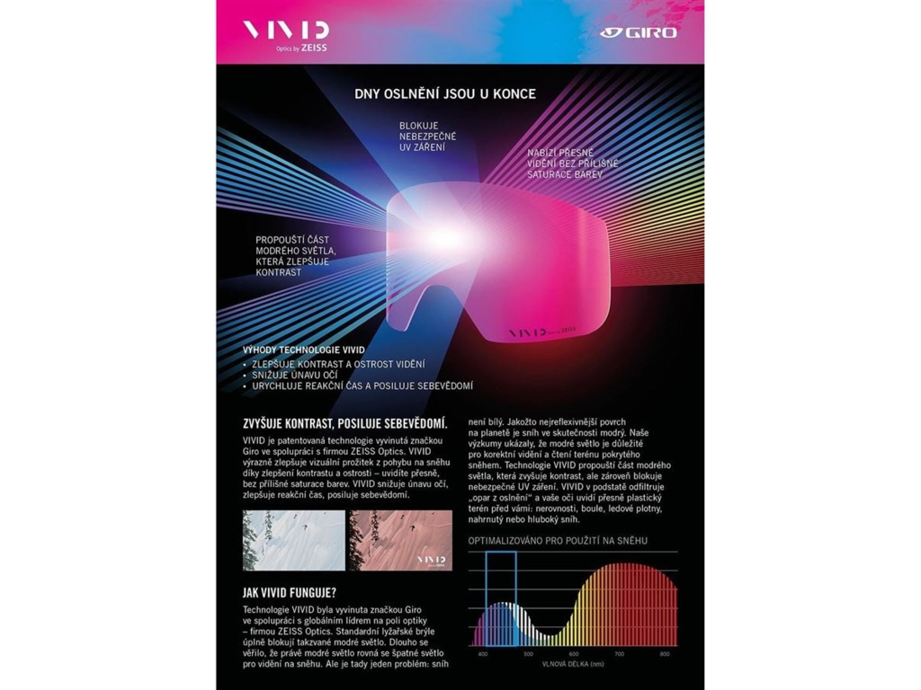 Technologie VIVID byla vyvinuta značkou Giro ve spolupráci s globálním lídrem na poli optiky – firmou ZEISS Optics. Standardní lyžařské brýle úplně blokují takzvané modré světlo. Dlouho se věřilo, že právě modré světlo rovná se špatné světlo pro vidění na sněhu. Ale je tady jeden problém: sníh není bílý. Jakožto nejreflexivnější povrch na planetě je sníh ve skutečnosti modrý. Výzkumy ukázaly, že modré světlo je důležité pro korektní vidění a čtení terénu pokrytého sněhem. Technologie VIVID propouští část modrého světla, která zvyšuje kontrast, ale zároveň blokuje nebezpečné UV záření. VIVID v podstatě odfiltruje „opar z oslnění“ a vaše oči uvidí přesně plastický terén před vámi: nerovnosti, boule, ledové plotny, nahrnutý nebo hluboký sníh.