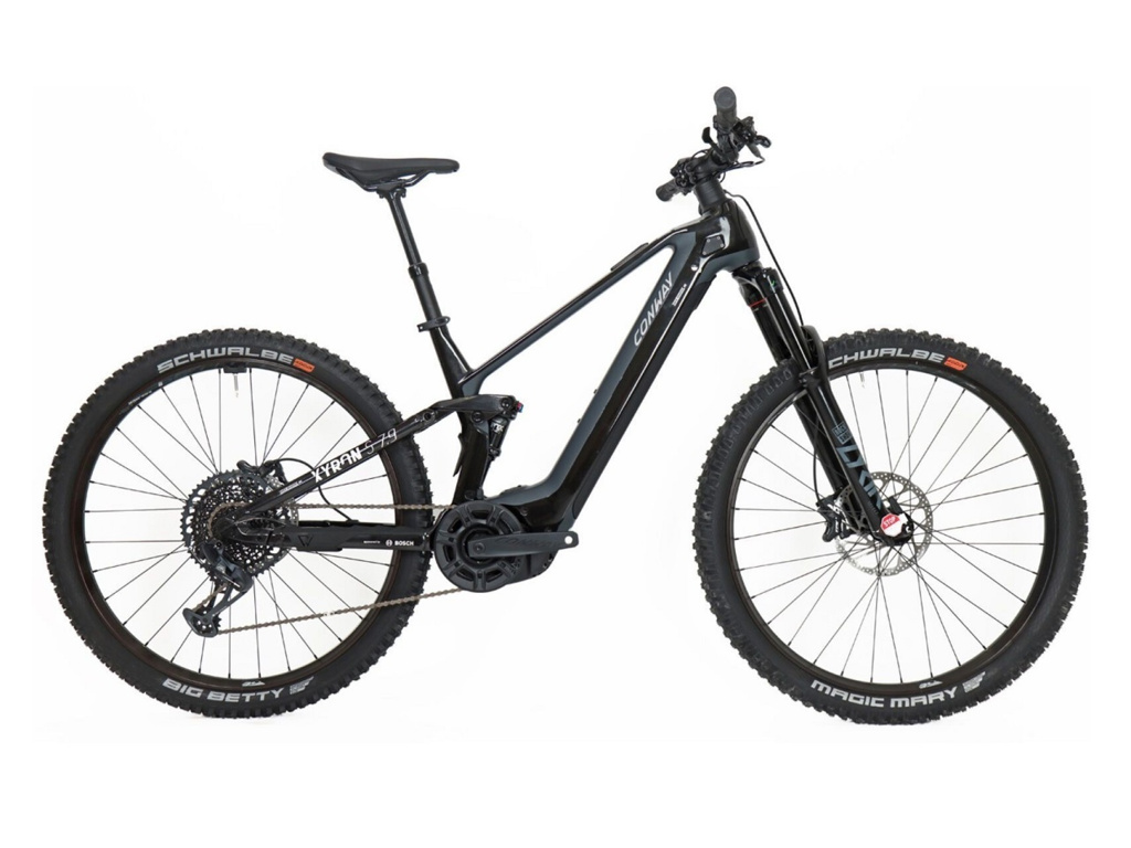 Celoodpružené elektrokolo Conway Xyron S 7.9 Carbon s nejvýkonnějším motorem Bosch CX 4. generace a integrovanou baterií 750 Wh. Za skvělou cenu nabízí moderní trailovou geometrii, karbonový rám s hliníkovou zadní stavbou, řazení Sram s 12 převody a výkonné čtyřpístkové brzdy TRP Slate EVO. Pro maximální jízdní komfort a ovladatelnost je vybaven také teleskopickou sedlovkou. Díky spojení špičkového zpracování, povedené rámové geometrie, osvědčeného pohonu Bosch a příznivé ceny patří celoodpružené modely Conway Xyron mezi nejoblíbenější elektrokola v naší nabídce.