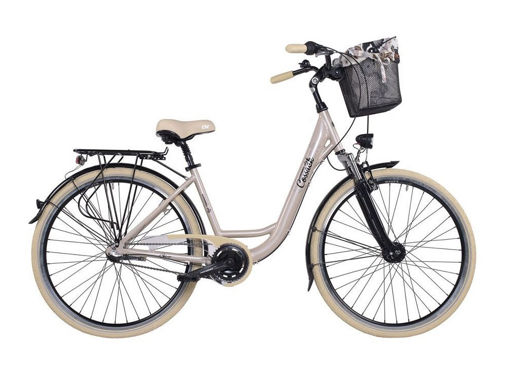 Dámské městské kolo Cossack s lehkým hliníkovým rámem, odpruženou vidlicí a tří rychlostním řazením v zadním náboji. Kolo je dále vybaveno kvalitním předním i zadním osvětlením, dynamem v předním náboji, košíkem na řídítkách, blatníky a nosičem.
