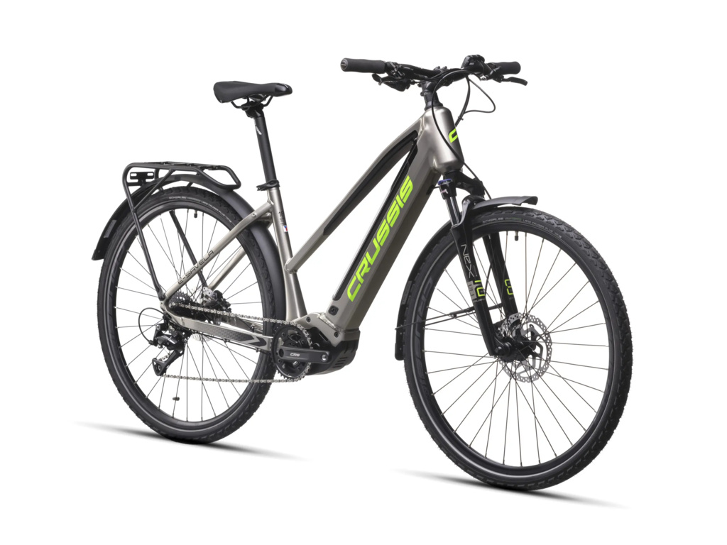 Trekingové elektrokolo CRUSSIS e-Savela 7.10 s výkonným motorem Panasonic GX Power Plus a baterií s kapacitou 518 Wh, která nabízí dojezd až 130 km. Snížená horní rámová trubka usnadňuje nasedání a sesedání z kola.