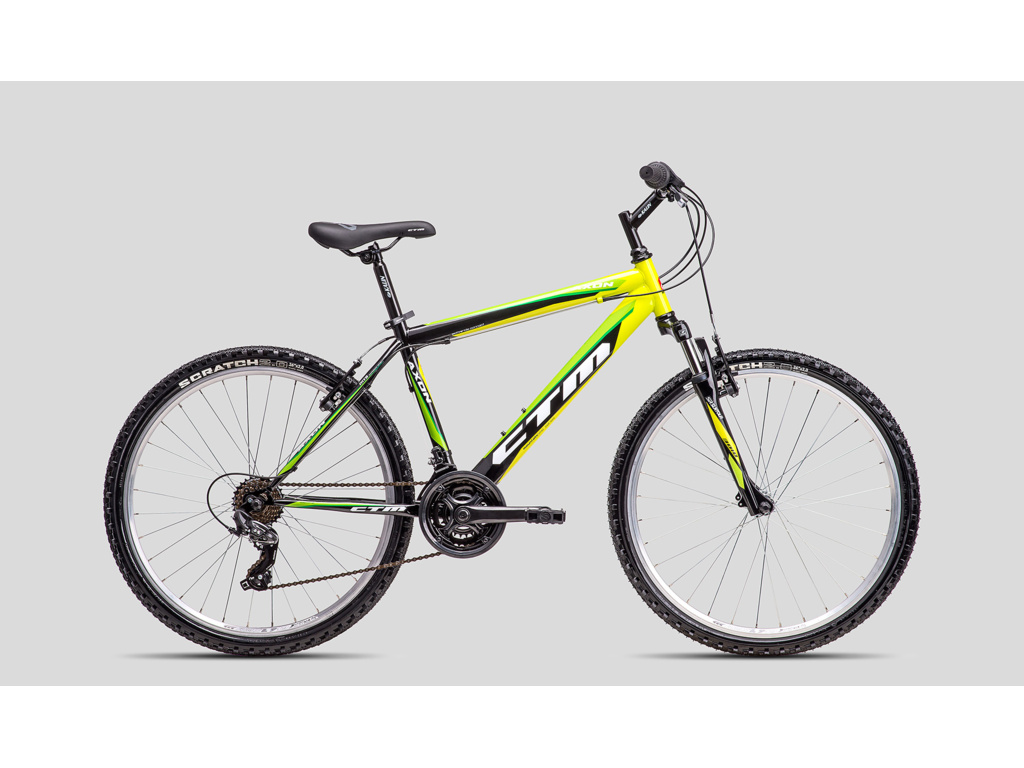 CTM Axon je základní model pánského horského kola pro příležitostné cyklisty. Základ tvoří odolný ocelový rám, který je osazen odpruženou vidlicí Suntour a komponenty Shimano s 3x6 převody a s ráfkovými brzdami.
