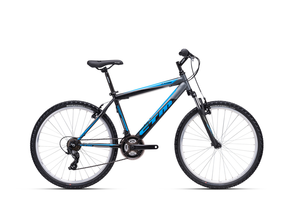 CTM Axon je horské kolo pro nenáročné jezdce. Ocelový rám je osazen odpruženou vidlicí Suntour, komponenty Shimano s 3x7 převody a s ráfkovými brzdami Alhonga.
