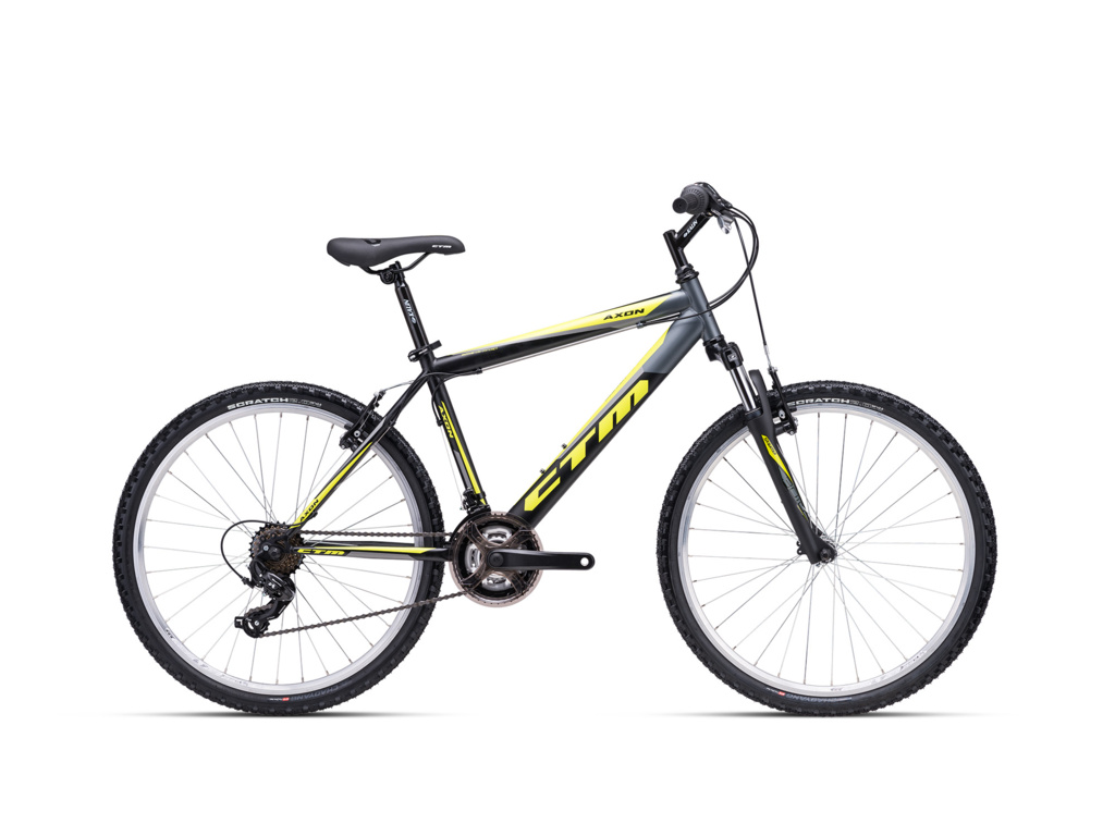 CTM Axon je horské kolo pro nenáročné jezdce. Ocelový rám je osazen odpruženou vidlicí Suntour, komponenty Shimano s 3x7 převody a s ráfkovými brzdami Alhonga.