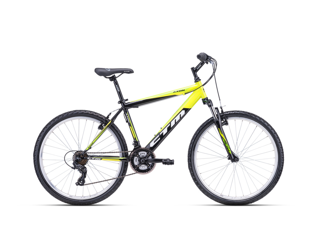 CTM Axon je horské kolo vhodné pro rekreační a víkendové použití. Lehký hliníkový rám je osazen odpruženou vidlicí Suntour, komponenty Shimano s 3x7 převody a s ráfkovými brzdami ALHONGA.