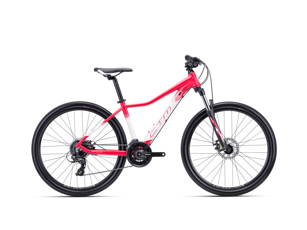 CTM Charisma 2.0 je dámské horské kolo vhodné pro rekreační cyklistky. Lehký hliníkový rám je osazen odpruženou vidlicí Suntour XCT, komponenty Shimano s 3x8 převody a s mechanickými kotoučovými brzdami Hayes.