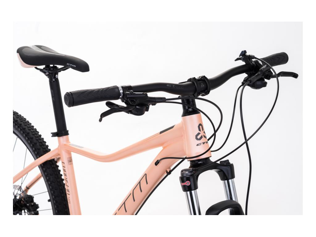 CTM Charisma 4.0 je oblíbený model dámského horského kola, které je vhodné pro rekreační cyklistky. Lehký hliníkový rám je osazen odpruženou vidlicí Suntour XCM, komponenty Shimano s 3x8 převody a hydraulickými kotoučovými brzdami Shimano BR-MT200.