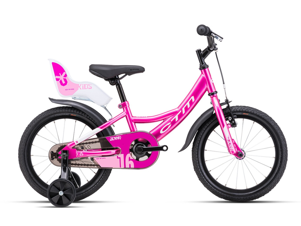 CTM Jenny je 16palcové dívčí kolo pro děti s výškou postavy od 100 do 120 cm. Má pevné ocelové tělo pro dobrou stabilitu a standardně je dodáváno s balančními kolečky, plastovými blatníčky a bezpečnostním krytem řetězu. Mladé slečny jistě ocení i sedátko pro panenky.