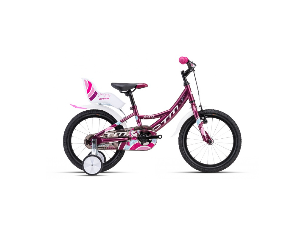 CTM Jenny je 16palcové dívčí kolo pro děti s výškou postavy od 100 do 120 cm. Má pevné ocelové tělo pro dobrou stabilitu a standardně je dodáváno s balančními kolečky, plastovými blatníčky a bezpečnostním krytem řetězu. Mladé slečny jistě ocení i sedátko pro panenky.