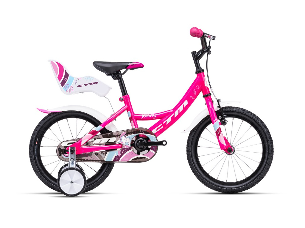 CTM Jenny je 16 palcové dívčí kolo pro děti s výškou postavy od 100 do 120 cm. Standardně je dodáváno s balančními kolečky, plastovými blatníčky a bezpečnostním krytem řetězu. Mladé slečny jistě ocení i sedátko pro panenky.