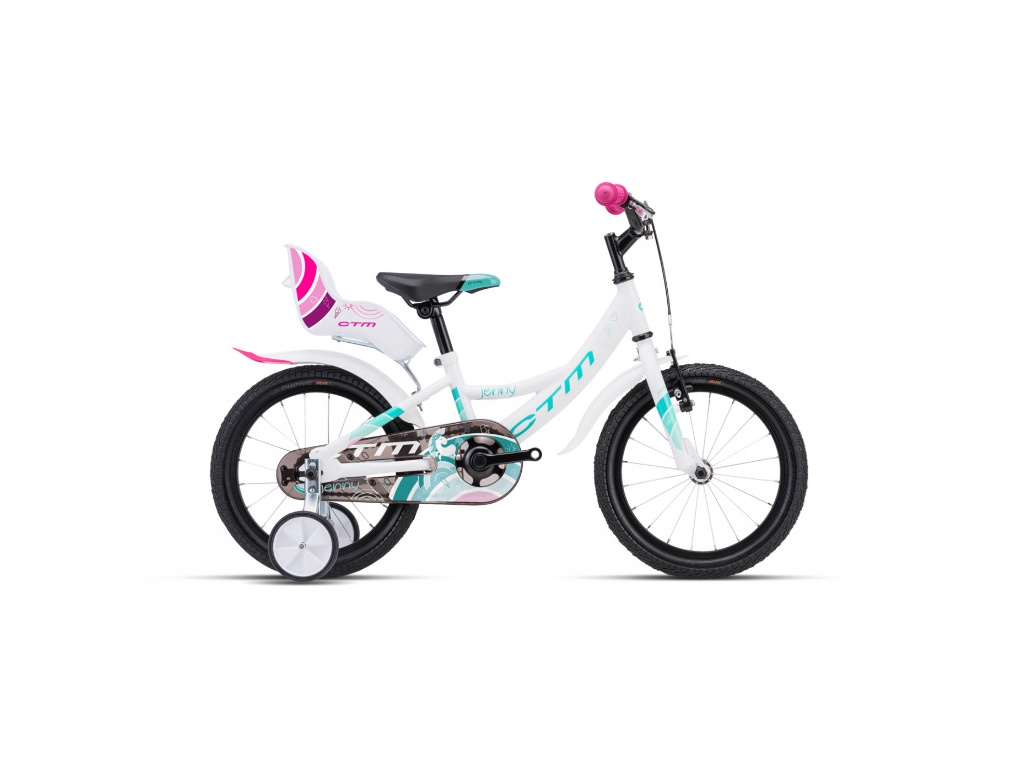 CTM Jenny je 16palcové dívčí kolo pro děti s výškou postavy od 100 do 120 cm. Má pevné ocelové tělo pro dobrou stabilitu a standardně je dodáváno s balančními kolečky, plastovými blatníčky a bezpečnostním krytem řetězu. Mladé slečny jistě ocení i sedátko pro panenky.