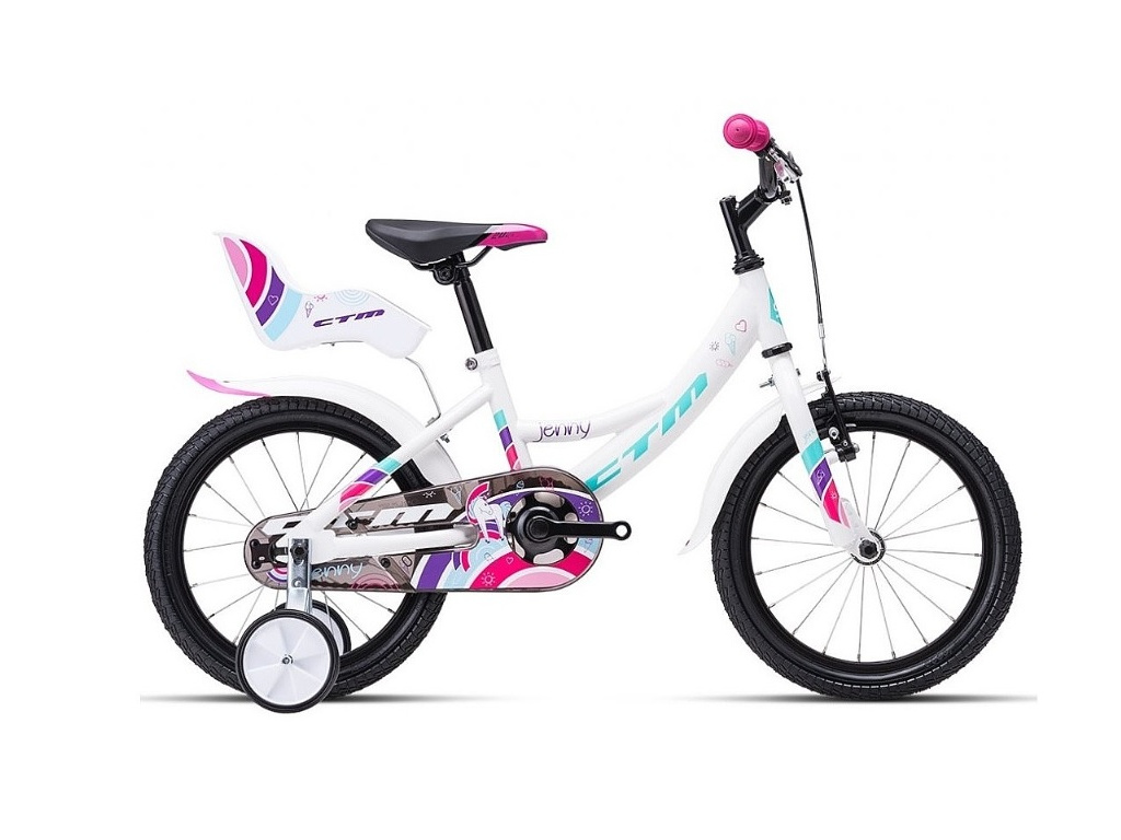 CTM Jenny je 16 palcové dívčí kolo pro děti s výškou postavy od 100 do 120 cm. Standardně je dodáváno s balančními kolečky, plastovými blatníčky a bezpečnostním krytem řetězu. Mladé slečny jistě ocení i sedátko pro panenky.