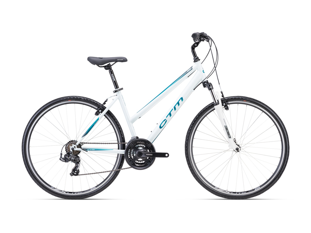 Dámské krosové kolo CTM Jessie se sníženou horní rámovou trubkou pro jednodušší nasedání a sesedání z kola. Ocelový rám, odpružená vidlice Suntour M3010, komponenty Shimano s 3x7 převody a užší pláště pro nenáročnou jízdu po cyklostezkách.