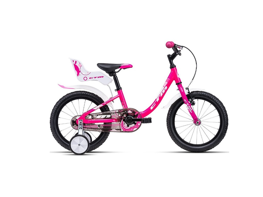 CTM Marry je 16 palcové dívčí kolo s lehkým hliníkovým rámem, pro děti s výškou postavy od 100 do 120 cm. Standardně je dodáváno s balančními kolečky, plastovými blatníčky, bezpečnostním krytem řetězu a sedátkem pro panenky.