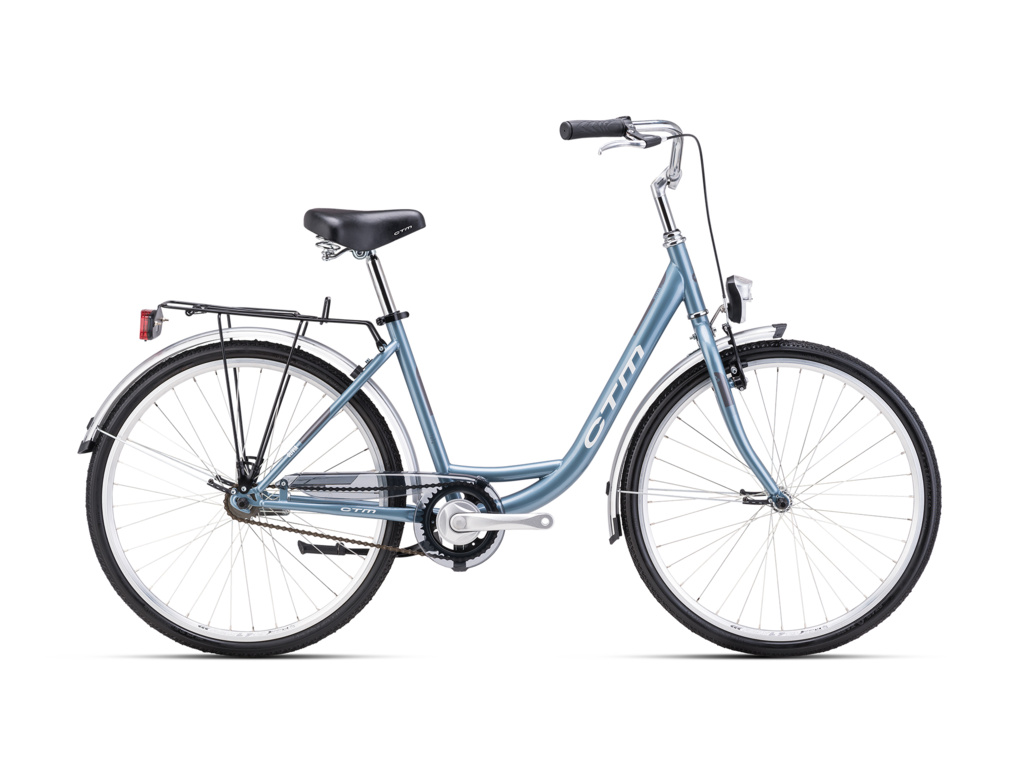 CTM Olivia 1.0 je dámské městské kolo s 26palcovými koly pro nenáročné. Základem je odolný rám vyrobený z Hi-Ten oceli a spolehlivá ráfková brzda Alhonga. Rám se sníženou trubkou zajišťuje pohodlné nastupování a sesedání z kola. Kolo je vybaveno zadním nosičem, blatníky, osvětlením a stojanem.