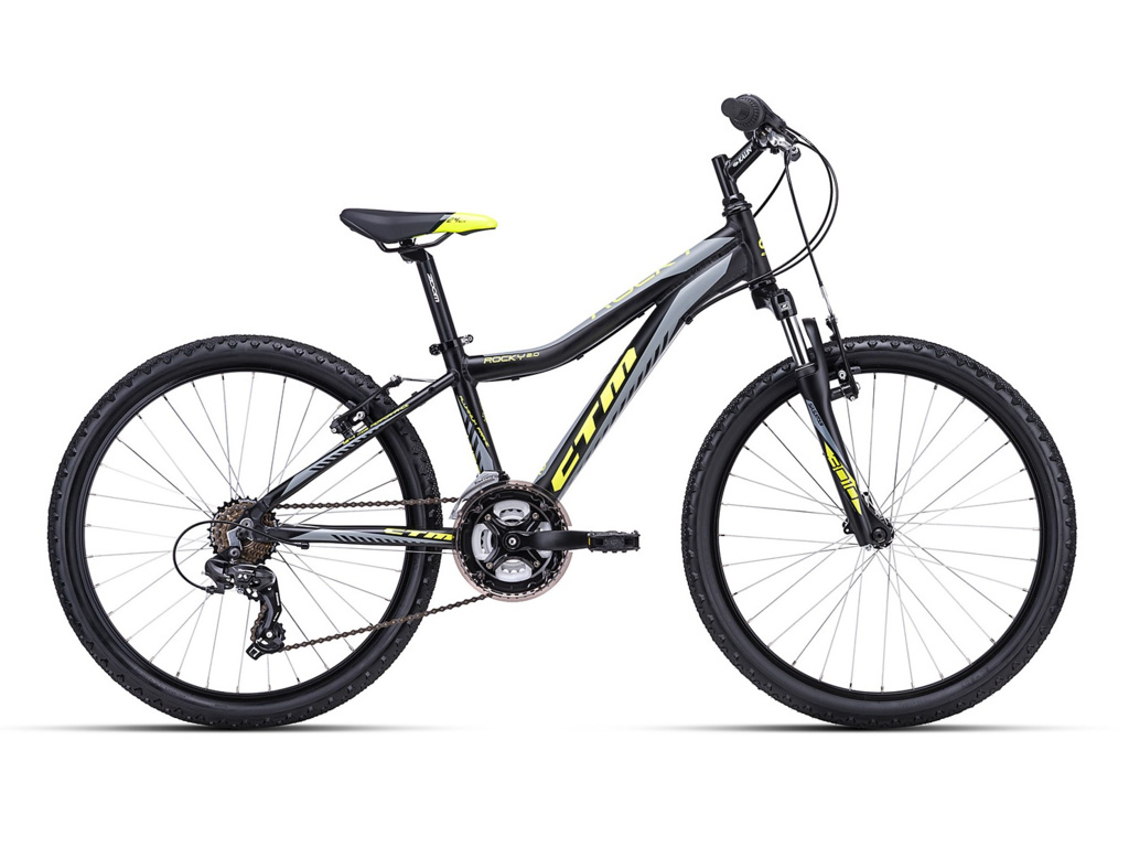 CTM Rocky 2.0 je dětské kolo s velikostí ráfků 24", vhodné pro děti s výškou postavy od 120 do 145 cm. CTM Rocky 2.0 je vybaven hliníkovým rámem, odpruženou vidlicí Suntour, ráfkovými V-brake brzdami a komponenty Shimano s 21 převody.