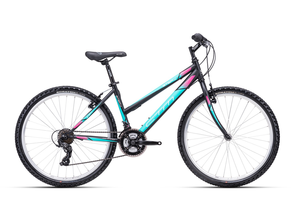 Základní model horského kola CTM Stefi 1.0 je osazen ocelovým rámem, pevnou vidlicí, komponenty Shimano s 3x7 převody a ráfkovými brzdami Alhonga. Spolehlivé kolo pro nenáročné rekreační cyklistky.