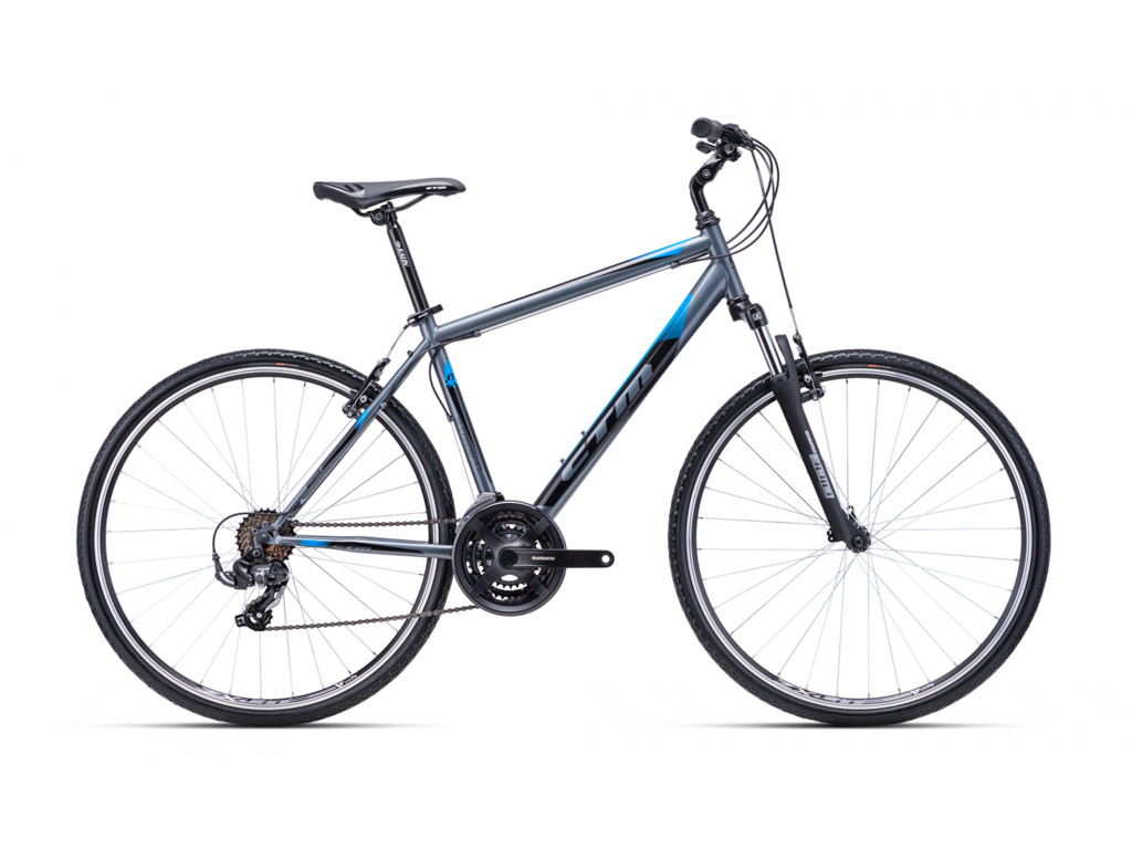 Krosové kolo CTM Streem se sníženou horní rámovou trubkou pro jednodušší nasedání a sesedání z kola. Ocelový rám, odpružená vidlice Suntour M3010, komponenty Shimano s 3x7 převody a užší pláště pro nenáročnou jízdu po cyklostezkách.