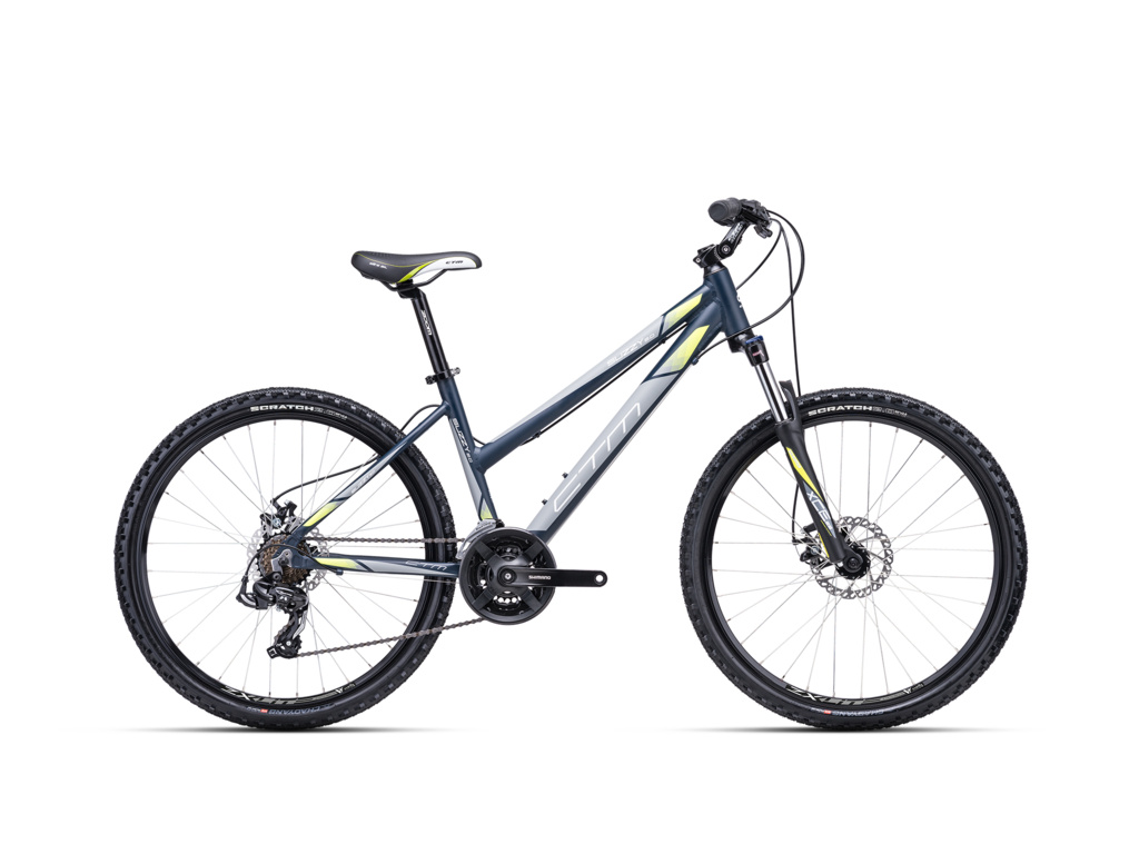 CTM Suzzy 2.0 je dámské horské kolo ideální pro vyjížďky po cyklostezkách a začátky v terénu. Lehký hliníkový rám je osazen odpruženou vidlicí Suntour se zdvihem 100 mm, komponenty Shimano s 3x7 převody a s kotoučovými brzdami Hayes.