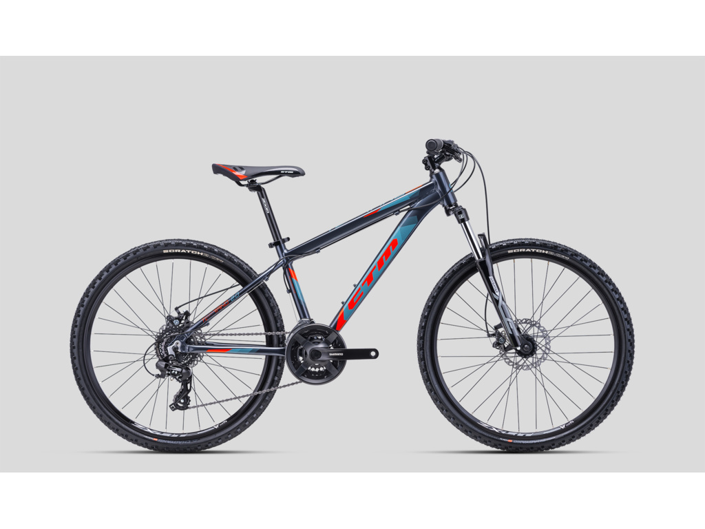 CTM Terrano 2.0 je juniorské horské kolo ideální pro vyjížďky po cyklostezkách a začátky v terénu. Lehký hliníkový rám je osazen odpruženou vidlicí Suntour, komponenty Shimano s 3x8 převody a s mechanickými kotoučovými brzdami Hayes.