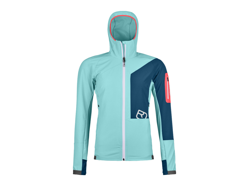 Dámská bunda s kapucí atletického střihu s elastickým lemem a pružnými manžetami, která byla vyvinuta speciálně pro potřeby skitouringu? To je model ORTOVOX Berrino s náprsní kapsou, dvouvrstvým límcem a rychleschnoucími vlastnostmi.