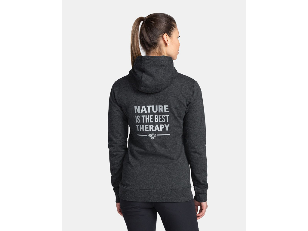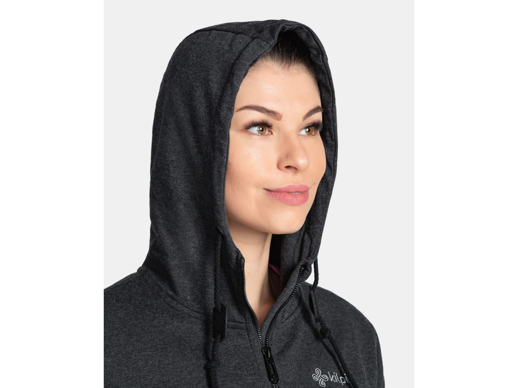 Dámská bavlněná celorozepínací mikina Kilpi BERY-W má kapuci na stahování pomocí šňůrky, dvě kapsy a je vyšší u krku.