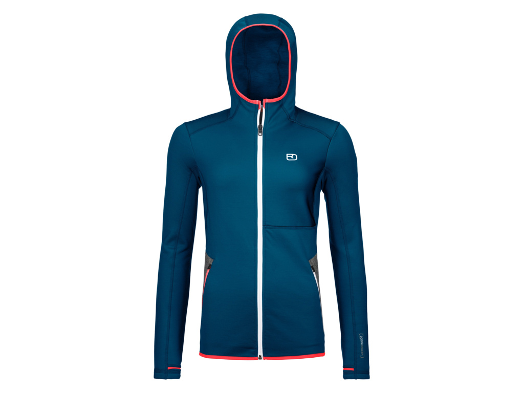 ORTOVOX Fleece je dámská mikina s kapucí, která reprezentuje perfektní funkčnost a dokonalý komfort tvořený prvotřídními materiály. Tasmánská vlna na vnitřní straně podporuje pocit pohodlí a tepla, polyester na vnější straně zajišťuje příjemný hladký povrch a dlouhou životnost. Mikina je vhodná jak pro extrémní sporty, tak pro každodenní nošení. Díky novému způsobu pletení má matný povrch a díky tradičnímu plstěnému lodenu na vnitřní straně kapes si zmrzlé ruce vždy snadno ohřejete. Mikina má dvě prostorné kapsy, kam se vejdou i předměty rozměru bloku A5, pro lepší teplotní komfort poutka na palec na lemech rukávů. Model má také kvalitní dlouhý YKK® zip, vyšší límeček, ergonomický střih a anatomicky tvarovanou kapuci.