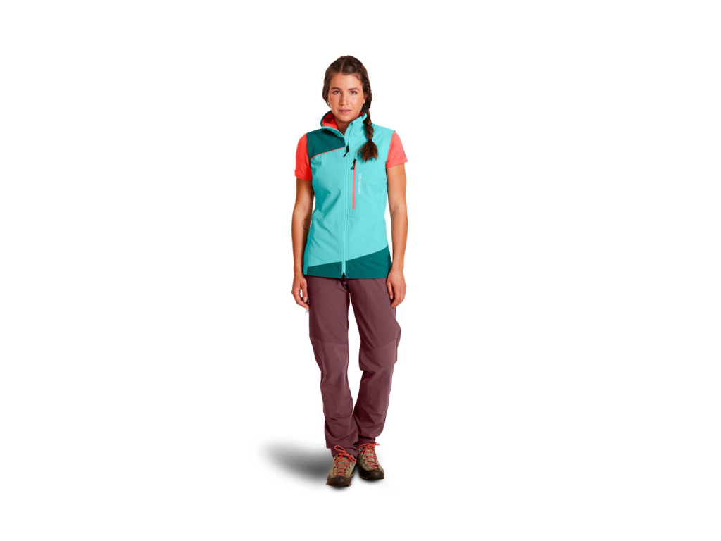 Vesta ORTOVOX PALA LIGHT VEST W má atletický střih a při lezení poskytuje maximální svobodu pohybu a pružnost. Technické prvky jako je pružný lem kolem ramen a vysoká elasticita ji předurčují pro lezení. Vesta má jednu prostornou hrudní kapsu, která pojme i poměrně velké věci jako například i mapu, nebo smartphone i svačinu. Zpevněné zóny na ramenou a kolem kyčlí chrání látku před oděrem.