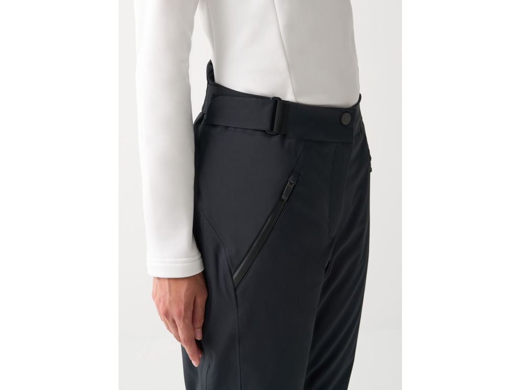Kalhoty skvěle sedí díky nastavitelnému pasu, ergonomicky tvarovanému zadnímu panelu a promyšlenému střihu, který podporuje volnost pohybu. Spodní části nohavic jsou vybaveny zipem a ochranným klínkem, který usnadňuje obouvání lyžařských bot a chrání před poškozením. Vnitřní sněhové manžety spolehlivě zabrání pronikání sněhu dovnitř.