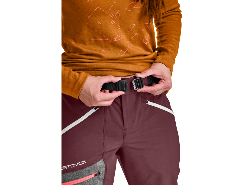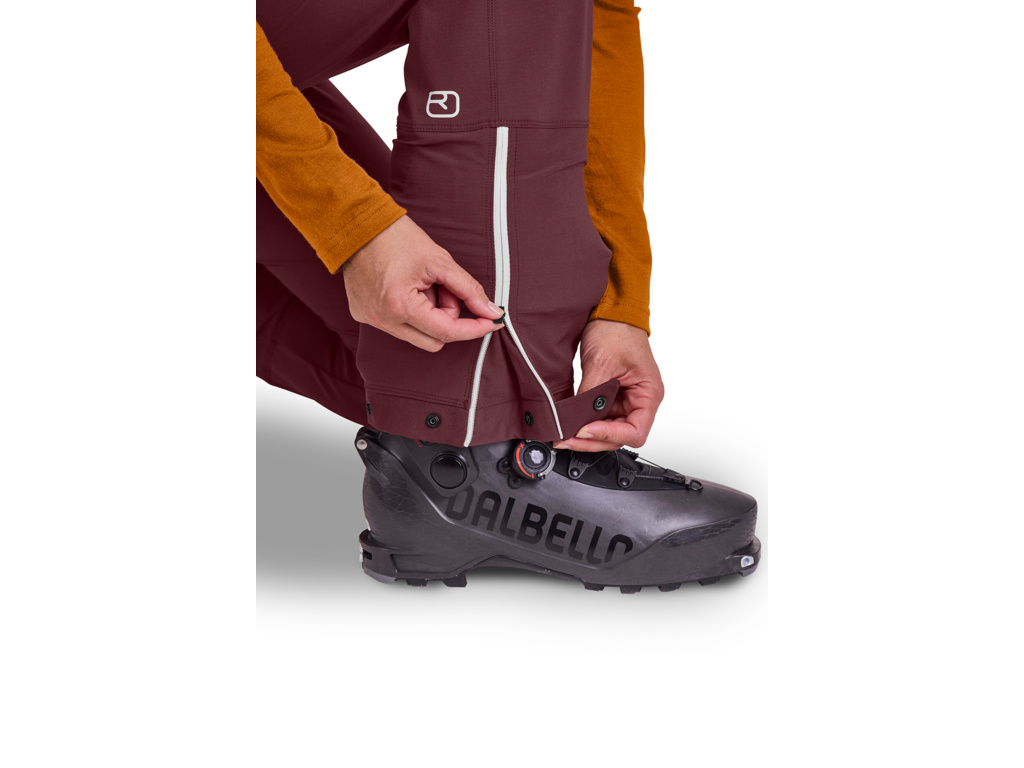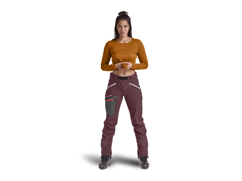 ORTOVOX Cevedale jsou dámské kalhoty, které se díky své neuvěřitelné odolnosti, pružnosti a technickým detailům hodí na jakékoli vysokohorské výpravy na lyžích i na laně. Materiál je zesílený v oblasti kotníků, kde je nejvíc namáhán při chůzi i lezení, nebo zde může dojít k prořezu mačkami či hranami lyží. Díky integrovaným návlekům na boty se na ně můžete spolehnout i v hlubokém sněhu a v nepříznivých povětrnostních podmínkách. Nový hybridní materiál MERINO AIRSOLATION zpracovaný pomocí technologie two-way stretch je odolný, vodoodpudivý, neprofoukne a díky žebrované konstrukci na vnitřní straně poskytuje optimální izolaci, o kterou se také stará vyčesaná merino vlna, která výrazně přispívá ke komfortu a odvodu potu. Tyto kalhoty přitom nevynikají pouze svými technickými parametry, ale navíc i skvěle vypadají. Model má na stehně estetickou kapsu z třívrstvého tradičního lodenu a dvě přední kapsy s podšívkou z Merino vlny na zahřátí rukou a jednu zadní kapsu. Veškeré zipy na kapsách jsou vyvedené v kontrastních barvách a doslova září.