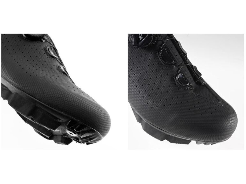 Svršek z mikrovlákna je perforovaný, aby optimalizoval prodyšnost a ventilaci a zajistil svěží a suché nohy po celou dobu jízdy. Vnitřní část boty je vybavena síťovinou, která poskytuje oporu noze a zlepšuje stabilitu. Systém zapínání, vybavený kolečkem BOA L6 s možností mikronastavení, zajišťuje přesné, rychlé a přizpůsobené zapínání a zabraňuje vzniku tlakových bodů.