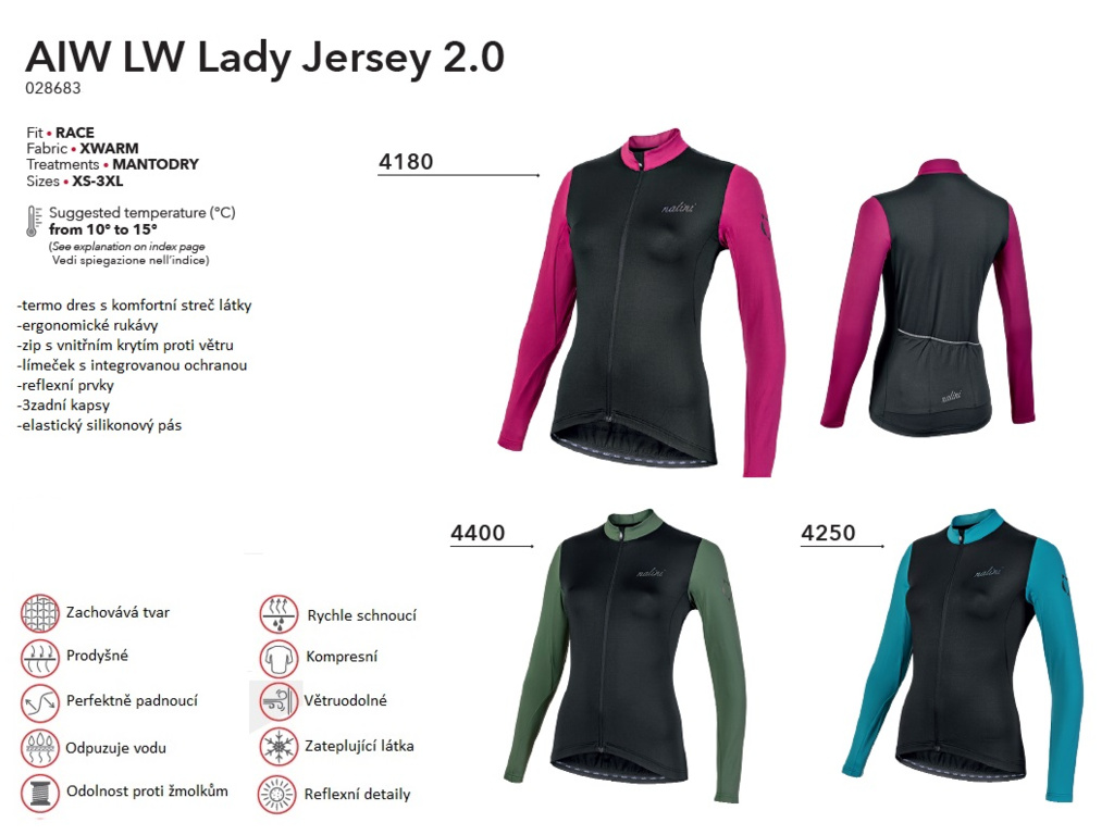 Mírně zateplený dámský dres s dlouhým rukávem Nalini AIW LW Lady, optimální pro teploty od 10 do 15°C.